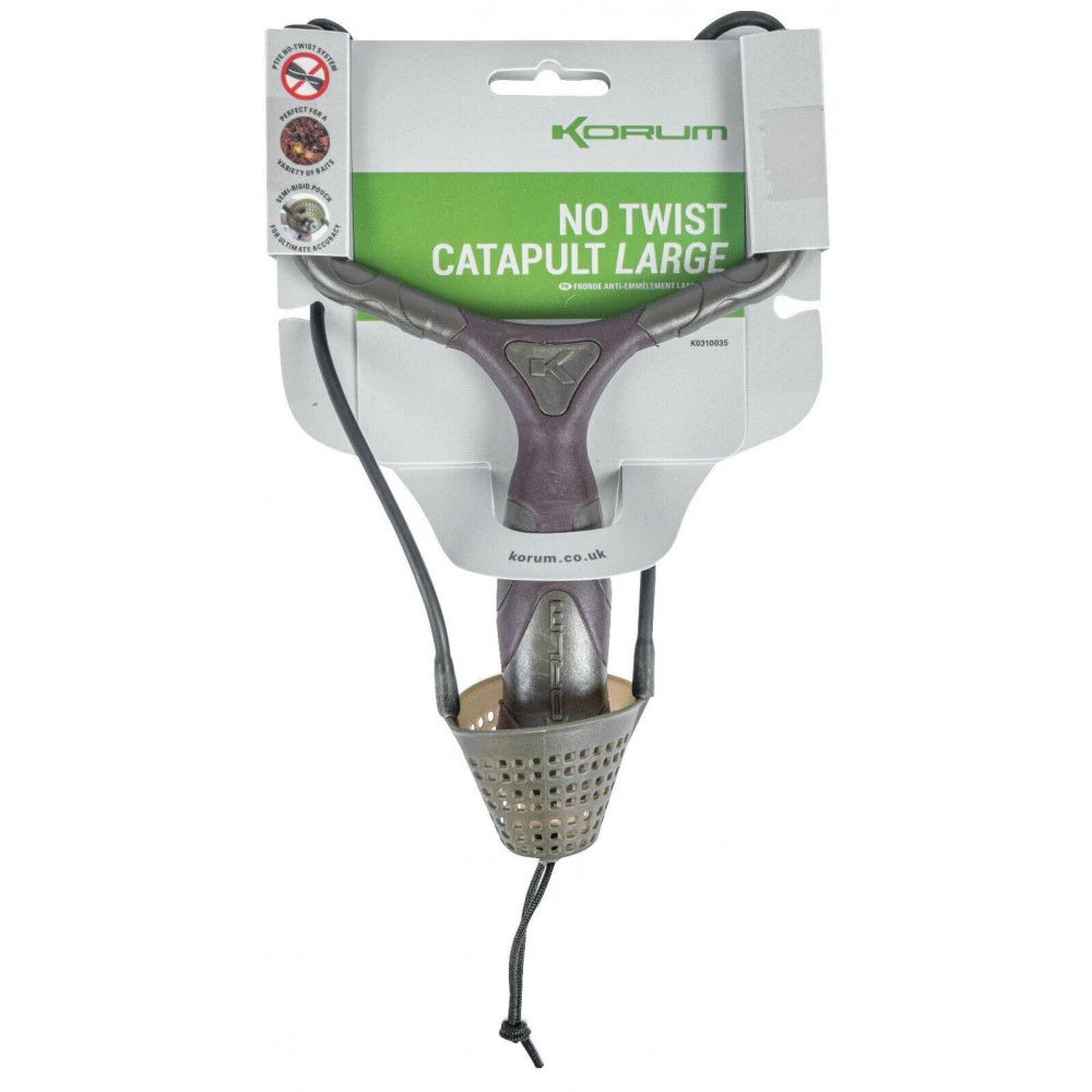 Korum No Twist Catapults Large, deze no twist catapults zijn speciaal ontwikkeld voor het wegschieten van natuurlijk aas zoals maden, casters, lunch worst of mais. Perfecte gereedschap voor diegene die betrouwbaarheid, nauwkeurigheid en duurzaamheid wil bij aanschaf van een katapult. Met Semi Mesh Pouch voor compacter voeren en het dual PTFE Anti-Twist technologie waar door de elastiek praktische onmoggelijk zich in de war kan draaien. Deze Range van katapults vergroot de efficiëntie van uw visserij tijdens de wedstrijd of de gewone visdag. Te verkrijgen in Medium en Large.