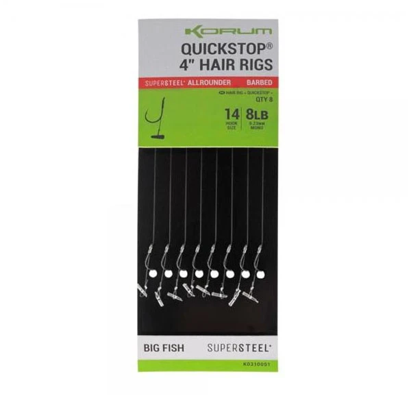 De Quickstop Hair Rigs – Barbed van Korum zijn speciaal voor het vissen met een hair rig gemaakt en zo ontworpen dat er een perfecte balans is tussen lijndikte en haakmaat. De Quickstop Hair Rigs zijn voorzien van een Supersteel haak met weerhaak en Quickstops.