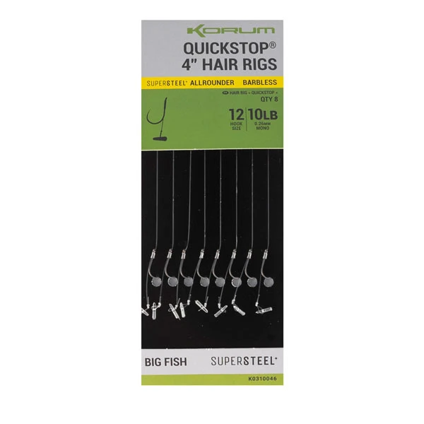 De Quickstop Hair Rigs – Barbless van Korum zijn speciaal voor het vissen met een hair rig gemaakt en zo ontworpen dat er een perfecte balans is tussen lijndikte en haakmaat. De Quickstop Hair Rigs zijn voorzien van een Supersteel haak zonder weerhaak en Quickstops.